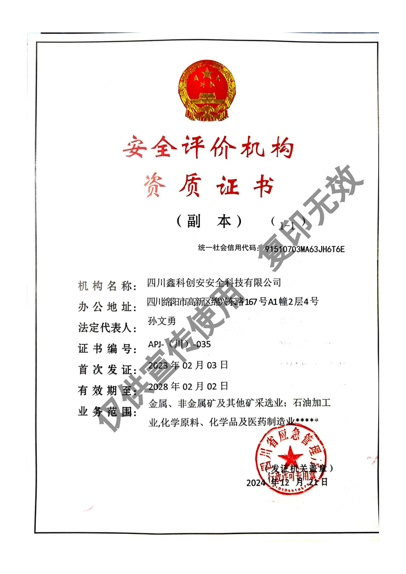 四川鑫科創(chuàng)安安全科技有限公司成立于2020年,是川北地區(qū)取得資質(zhì)的民營安全評價機(jī)構(gòu)(資質(zhì)證書編號:APJ-(川)-035)。并于2022年牽頭成立綜合應(yīng)急救援隊伍 - 綿陽曙光應(yīng)急救援中心。